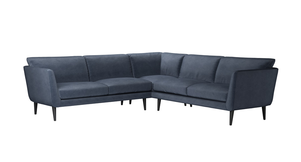 The Holly's retro-inspired shape and simple elegance is a nod to the sleek and curvy mid-century style. A neat frame - with high, splayed arms, a deep seat, and lots of comfy cushions - sits on tall tapered legs. This is one cool sofa. back cushions: 100% feather color: Blue, Grey covers: fixed seat cushions: feather wrapped foam size: Medium Corner Sofa