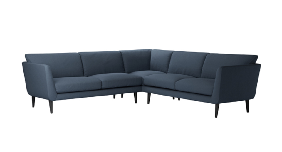 The Holly's retro-inspired shape and simple elegance is a nod to the sleek and curvy mid-century style. A neat frame - with high, splayed arms, a deep seat, and lots of comfy cushions - sits on tall tapered legs. This is one cool sofa. back cushions: 100% feather color: blue covers: fixed seat cushions: feather wrapped foam size: Medium Corner Sofa