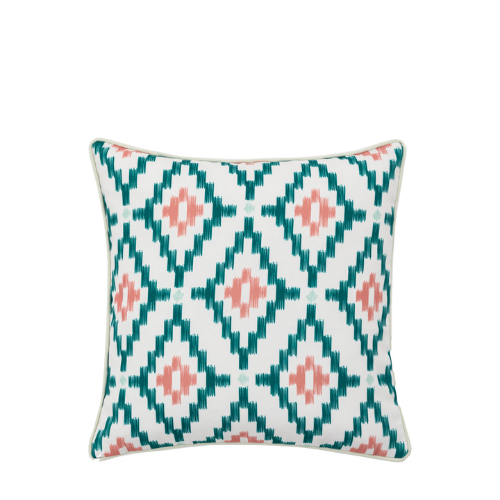 Perfect for adding the wow factor to your space inside or out. This cushion's striking coral & green geometric pattern and showerproof fabric make it a must have addition to your space, wherever you use it. Material: Polyester Product Zone: Indoor Fabric Weight: Front: 210 GSM / Rear: 210 GSM Filling - SOFT FURN: Poly Fibre Filled in UK: Yes Technique: Front: Printed / Rear: Printed Care Instructions - Textiles: 30 Degrees / Do Not Bleach / Do Not Tumble Dry / Do Not Iron / Do Not Dry Clean / Wash Dark Colours Separately