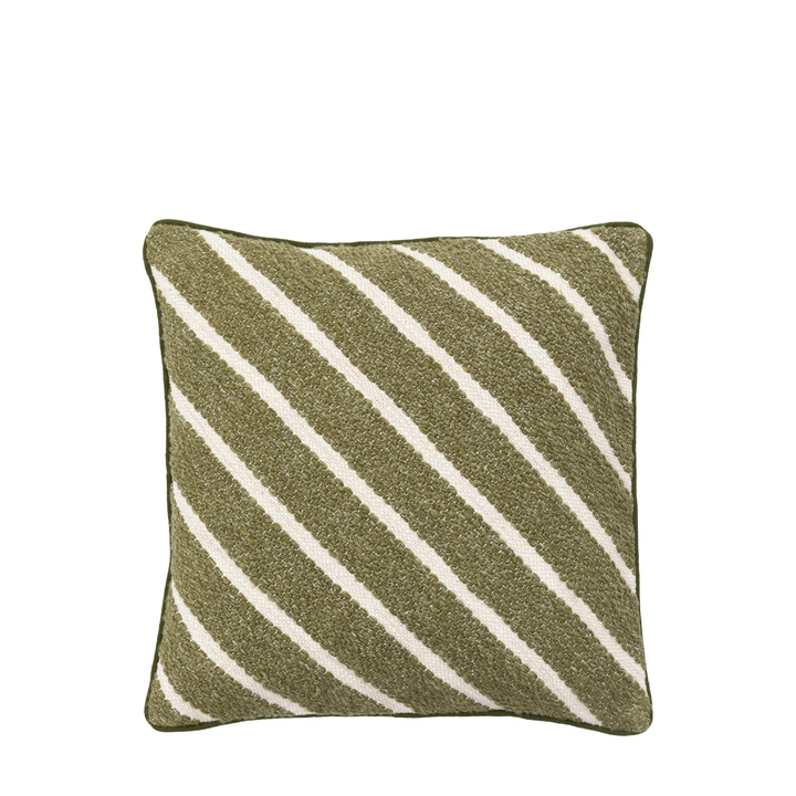 Add a touch of style and comfort to your room with this soft and cosy cushion. With a striking diagonal stripe design in olive green, this cushion will perfectly complement a wide variety of interior decors. Material: Front: Cotton / Polyester Back: Cotton Product Zone: Indoor Fabric Weight: Front: 310 GSM / Rear: 280 GSM Filling - SOFT FURN: Feather Filled in UK: Yes Technique: Front: Yarn Dyed Woven / Rear: Fabric Dyed Care Instructions - Textiles: Do Not Wash / Do Not Bleach / Do Not Tumble Dry / Do Not Iron / Do Not Dry Clean / Spot Clean Only