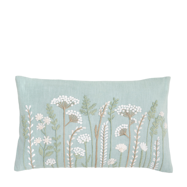 Step into spring with this detailed cushion. Embroidered with an intricate meadow of white and sage wildflowers this pale blue cushion is charming addition to your room. Material: Cotton / Linen Product Zone: Indoor Fabric Weight: Front: 150 GSM / Rear: 250 GSM Filling - SOFT FURN: Feather Filled in UK: Yes Technique: Front: Embroidered / Rear: Plain Woven Care Instructions - Textiles: Do Not Wash / Do Not Bleach / Do Not Tumble Dry / Do Not Iron / Do Not Dry Clean / Spot Clean Only