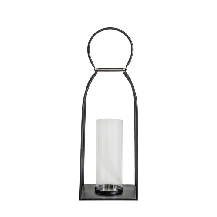 This unusual lantern features a black metal framework with open sides and a glass cylinder to enclose the candle. Perfect for use throughout the year, internally or in the garden over the summer. A smaller version is also available, as well as versions with an antique gold effect finish. They look great used individually or grouped together. Material: Steel / Glass