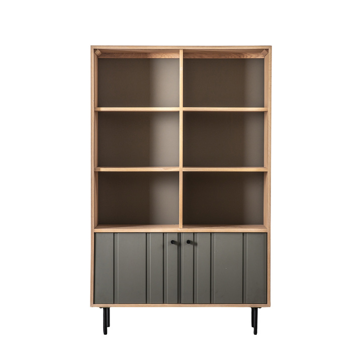 A contemporary furniture collection featuring a fusion of Japanese minimalism and Scandi style, creating these beautiful modern Japandi design piece. Natural oak has been paired with mid-grey painted, with routing to create a relief design adding detail to the doors.\n\nThis open display unit features six open shelves, with mid-grey painted panels behind to match the cupboard doors. Slim black metal legs and matching handles complete the stylish design. Material: Oak / Steel / MDF Clearance to Floor: 160mm Storage: 2 Doors / 10 Shelves Internal Cupboard Size: 480x310x320mm (6) + 480x310x180mm (4) Adjustable Shelves: No Distance between shelves: 320mm (6) / 180mm (4) Assembly Required: Yes - legs / feet only Anti Topple Kit: Yes