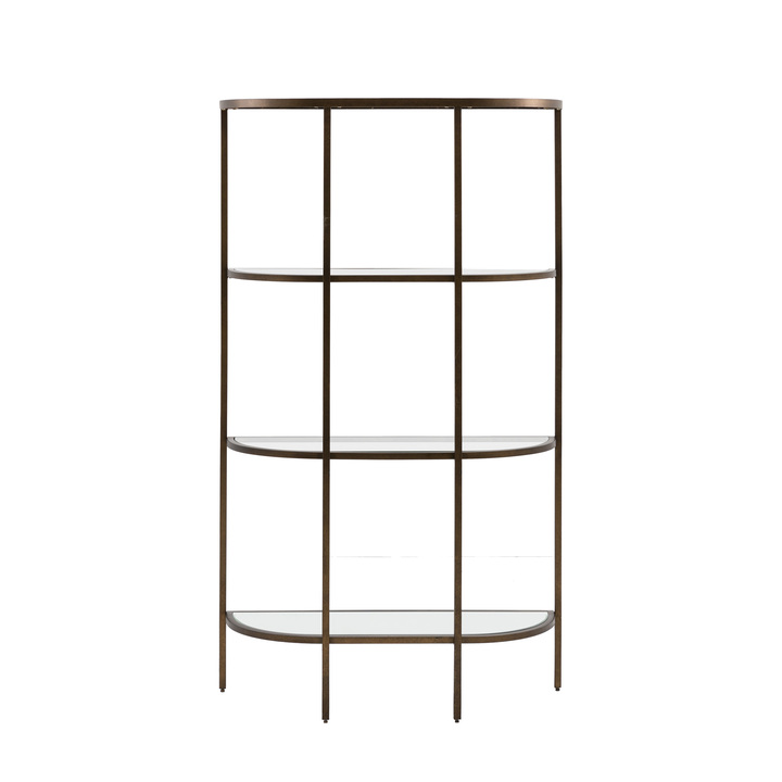 Glamorous 4 shelf display unit with a beautifully elegant curved shape. The 3 glass shelf inserts and a mirror glass bottom shelf sit in a vintage bronze metal frame, perfect for adding a luxurious touch to any room. Material: Metal / Glass Product Zone: Indoor Leg Finish: Aged Gold Leaf Clearance to Floor: 200mm Adjustable Shelves: No Distance between shelves: 200mm / 500mm / 485mm / 485mm Assembly Required: Yes - full Anti Topple Kit: Yes