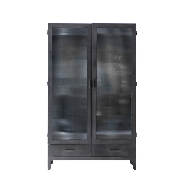 For a retro feel, this 2 door display unit offers an updated take on a classic 50’s look. The matt grey finish of the steel pairs beautifully with the ridged tempered glass creating a stunning piece which would look at home in a wide variety of interiors, including orangeries and conservatories to add an unusual twist to their look. There is also a 1 door version. Material: Iron / Glass Product Zone: Indoor Storage: 2 Doors / 2 Drawers / 2 Shelves Internal Cupboard Size: 1315x900mm Adjustable Shelves: Yes Distance between shelves: Adjustable Shelves Assembly Required: Yes - shelves only Anti Topple Kit: Yes Additional Information: Tempered glass