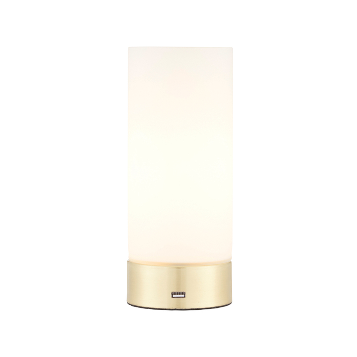 A sleek dual purpose table light finished in a brushed brass effect plate, with a matt opal glass shade. This light is operated by clever 3 stage touch technology, plus has the addition of a discreet USB port meaning it can charge your devices too. Material: Glass / Steel Product Zone: Indoor Bulb Included: No Bulb Type: 40W E14 candle Product Lumens: 400 Lumens Per Watt: 10 Cable Length: 1500mm Switch Type: Touch 3 stage dimmer switch Dimmable: Dimmer Included Voltage: 220-240V Class: Class 2 IP Rating: 20