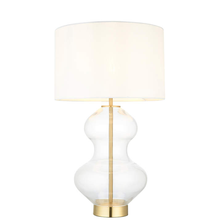 Elegant and extremely versatile, this classic table light features a clear glass base with a vintage white fabric shade. Its distinctive hourglass silhouette is the ideal partner for either contemporary or classic interiors. Available in satin brass or polished nickel with a three-stage touch dimmer. Material: Fabric / Glass / Steel Product Zone: Indoor Bulb Included: No Bulb Quantity: 1 Bulb Type: E27 GLS Cable Length: 1500mm Switch Type: Touch 3 Stage Dimmer Switch Dimmable: Dimmer Included Voltage: 220-240V Class: Class 2 IP Rating: 20