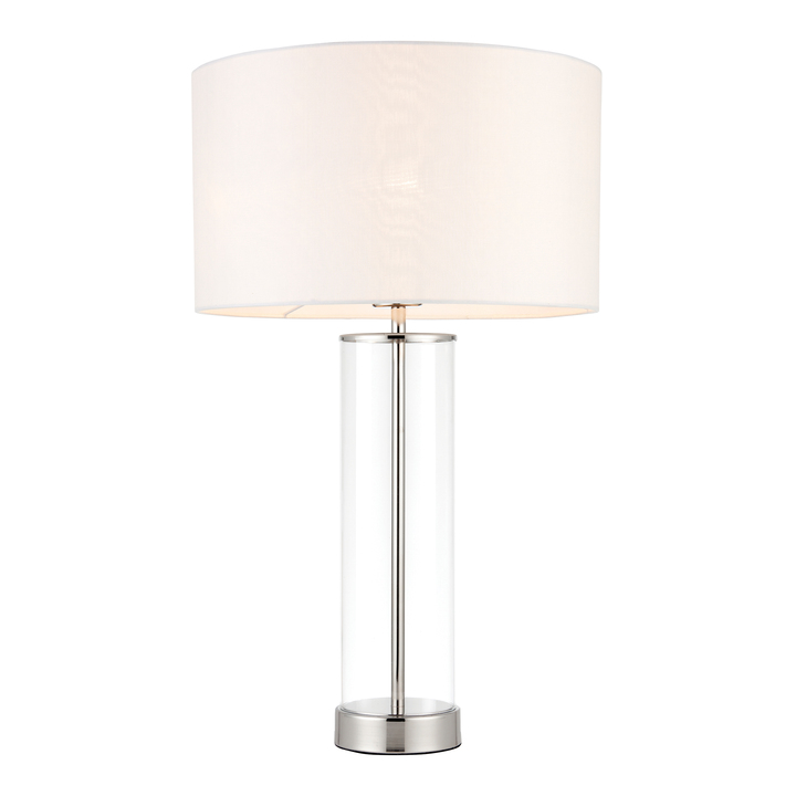Beautifully simple table light with a clear glass base, vintage white faux silk shade and a bright nickel effect finish. Dimmable via a clever 3 stage touch dimmer Material: Fabric / Glass / Steel Product Zone: Indoor Bulb Included: No Bulb Type: 40W E27 GLS Product Lumens: 400 Lumens Per Watt: 10 Cable Length: 1500mm Switch Type: Touch 3 stage dimmer switch Dimmable: Dimmer Included Voltage: 220-240V Class: Class 2 IP Rating: 20