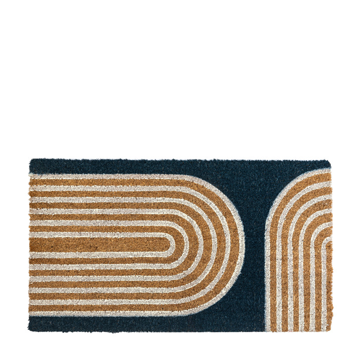 A stylish and modern doormat featuring a painted arch stripe design and bold teal colour block. Ideal for adding style and practicality to any entranceway. Material: Coir / PVC