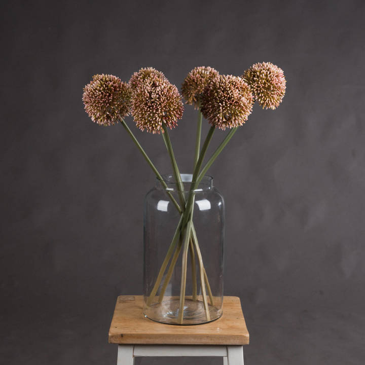 Unveil botanical sophistication in your store with our stunning Pink Allium stems. These masterfully crafted faux florals faithfully replicate the globular charm of Allium schubertii, featuring delicate pink florets clustered atop robust green stalks. Offering year-round appeal, they provide a maintenance-free alternative to fresh cut flowers while maintaining an air of natural elegance. Pair these striking blooms with complementary faux peonies or hydrangeas for a romantic summer arrangement, or mix with dried grasses for a modern, textural display. The soft pink hues harmonize beautifully with both neutral and bold color schemes, making them versatile additions to various interior styles from rustic farmhouse to contemporary chic. Ideal for creating eye-catching centerpieces, these Pink Alliums will entice customers seeking sophisticated artificial botanicals. Their realistic appearance and lasting quality ensure repeat sales and satisfied clientele. Stock these stunning stems to offer your customers a touch of botanical artistry that endures season after season.