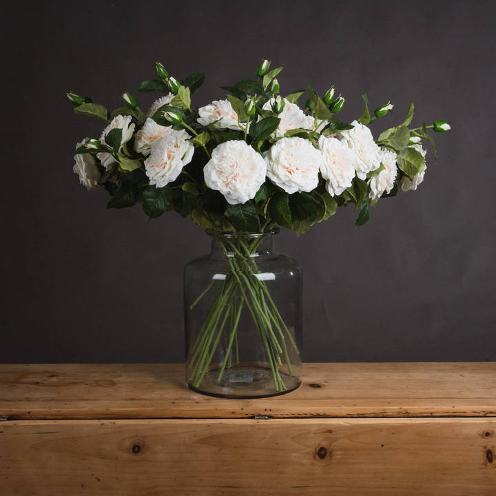 Captivate your customers with our exquisite White Garden Rose Spray, a botanical masterpiece that embodies timeless sophistication. This lifelike arrangement showcases the cherished Rosa x grandiflora in its full glory, featuring delicate ivory petals that unfold in layers of soft, romantic allure. Each 80cm spray presents an array of pristine roses at various stages of bloom, from elegant buds to fully open flowers, creating a naturally dynamic display. The arrangement is complemented by verdant foliage with realistically textured leaves and stems, providing a perfect backdrop for the creamy white blossoms. Crafted from premium materials, this versatile spray offers a durable, low-maintenance alternative to fresh flowers. It's perfect for creating stunning centerpieces, adorning mantels, or infusing any interior with refined charm.Pair these classic white roses with faux baby's breath for a traditional aesthetic, or combining them with vibrant peonies and dahlias for a contemporary look. The neutral palette harmonizes with diverse interior styles, from rustic farmhouse to sleek modern designs. Showcase these sprays in weathered ceramic vases for a country cottage feel, or display them in polished glass cylinders for an urban chic vibe. Their universal appeal makes them ideal for retailers serving wedding planners, home decor enthusiasts, and those seeking to bring perpetual garden beauty indoors. Add this remarkable White Garden Rose Spray to your inventory and offer your customers a touch of floral perfection that will enhance any space with its enduring elegance and versatile charm.