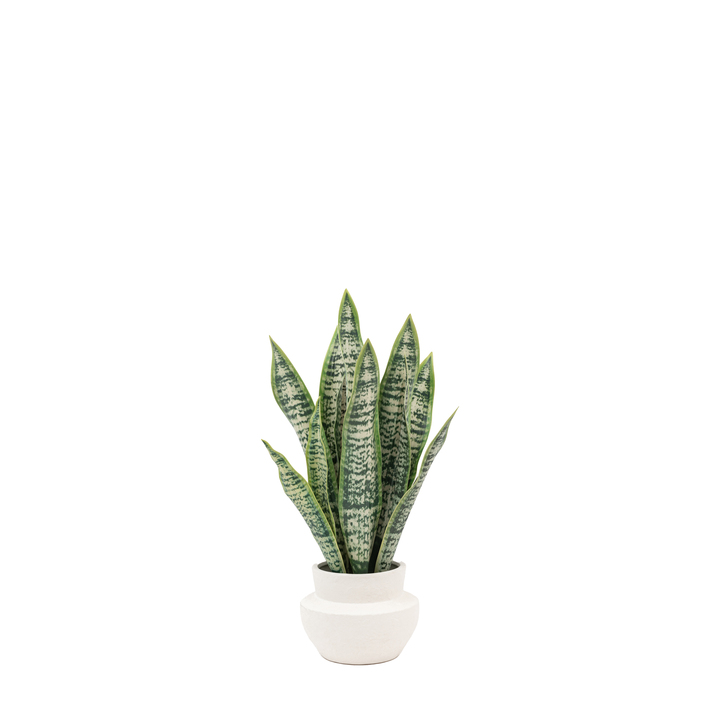 Add a bit of greenery to your room with his eye catching faux snake plant. The realistic leaves feature the distinctive pattern of the snake plant, perfectly complemented by plan matt ceramic pot. Material: Ceramic / Iron / Plastic Product Zone: Indoor