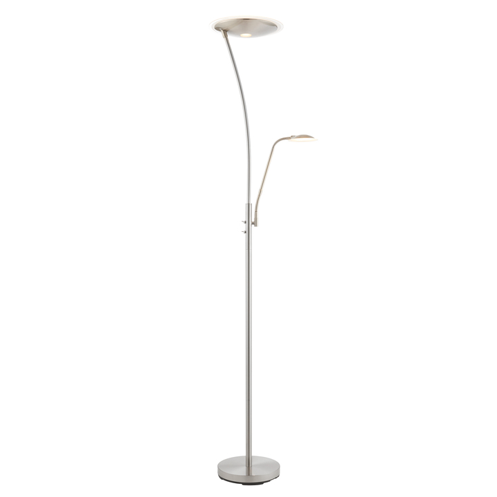An LED mother and child floor light finished in a satin chrome effect plate with a white frosted dish. Main light and task light can be lit together or separately from each other. Task light has an adjustable arm to direct light as required. Material: ABS Plastic / Steel Product Zone: Indoor Bulb Included: Yes Bulb Type: 18W LED module (SMD 2835) Warm White & 6W LED module (SMD 2835) Warm White Product Lumens: 1440 Lumens Per Watt: 80 Kelvin: 3000 Cable Length: 2000mm Switch Type: Toggle Switch Dimmable: Non dimmable Voltage: 220-240V Class: Class 2 IP Rating: 20