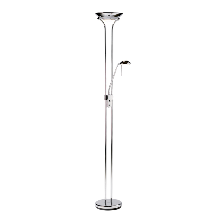 A tall 2 light floor lamp with a double stand supporting an uplighter as well as an adjustable branch holding a reading lamp. Has a satin chrome finish and is complete with a double rotary dimmer switch. Other colour options available Material: Glass / Steel Product Zone: Indoor Bulb Included: No Bulb Type: 230W R7s tungsten (117mm) & 33W G9 clear capsule Product Lumens: 4645 Lumens Per Watt: 20 Kelvin: 3000 Cable Length: 1800mm Switch Type: Double Rotary Dimmer Switch Dimmable: Dimmer Included Voltage: 220-240V Class: Class 1 IP Rating: 20