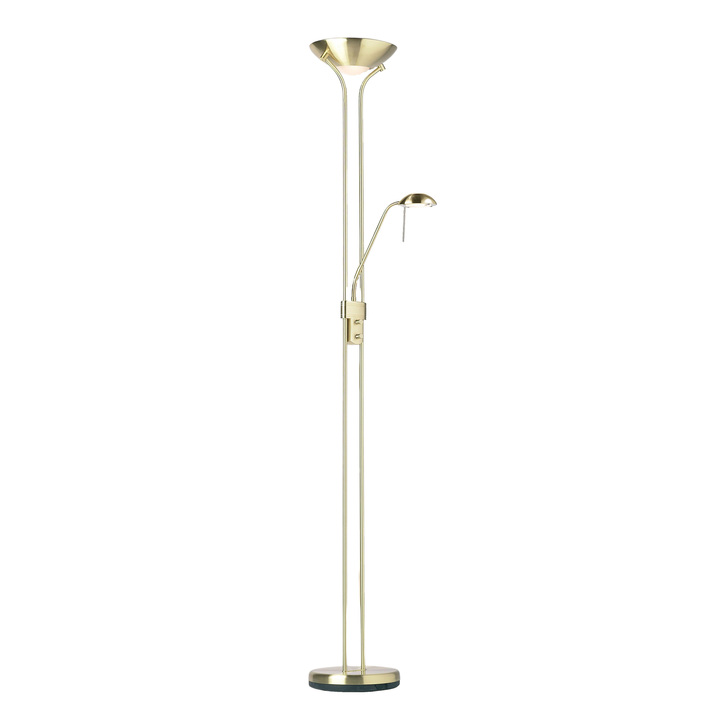 A tall 2 light floor lamp with a double stand supporting an uplighter as well as an adjustable branch holding a reading lamp. Has a satin brass finish and is complete with a double rotary dimmer switch. Other colour options available Material: Glass / Steel Product Zone: Indoor Bulb Included: No Bulb Type: 230W R7s tungsten (117mm) & 33W G9 clear capsule Product Lumens: 4645 Lumens Per Watt: 20 Kelvin: 3000 Cable Length: 1800mm Switch Type: Double Rotary Dimmer Switch Dimmable: Dimmer Included Voltage: 220-240V Class: Class 1 IP Rating: 20
