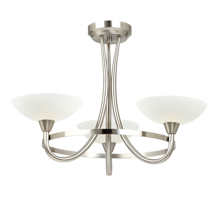 This 3 light semi flush is finished in satin chrome effect with white painted glass shades with faint line detailing will add a touch of elegant sophistication to any home. suitable for use with LED lamps and dimmable; matching 5 light semi flush and wall light options and satin chrome finish also available Material: Glass / Steel Product Zone: Indoor Bulb Included: No Bulb Type: 3 x 33W G9 clear capsule Product Lumens: 458 Lumens Per Watt: 14 Kelvin: 2800 Dimmable: Dimmable Voltage: 220-240V Class: Class 1 IP Rating: 20