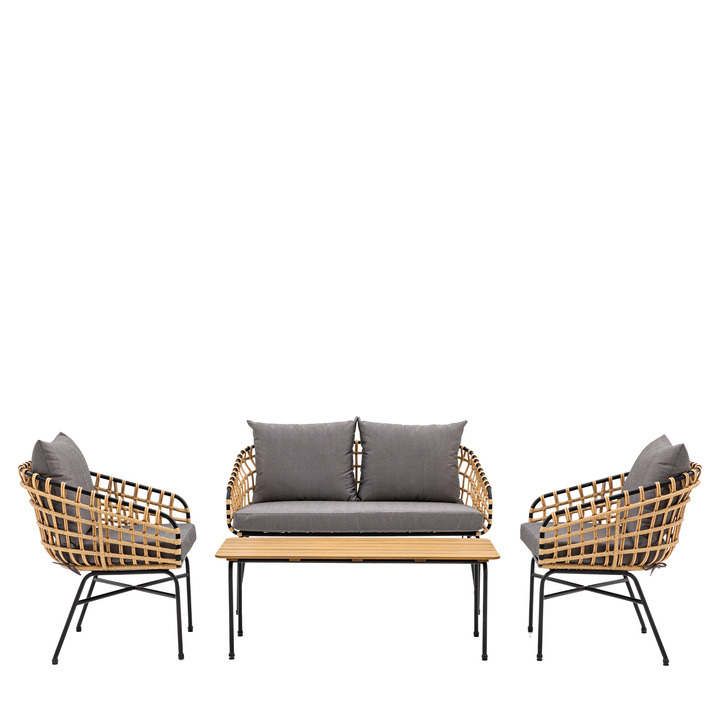 Perfect for your suntrap garden this set features a stylish 2 seater sofa and 2 armchairs with unique eye catching woven detail around the arms and back, these are complemented by the simple wood topped coffee table. Made with powered coated steel frames with 5mm round woven wicker detail. Material: Steel / Wicker / Acacia / Foam and Polyfibre / Polyester Fabric Product Zone: Outdoor Additional Information: Cushions are shower resistant only, not waterproof, and must not be left out in the rain or wet conditions, as this will cause damage and staining due to the fire-resistant treatment applied. Cushions should be stored away when not in use to keep the Set includes - OTDR: 1 x 2 Seater Sofa: W1420 x D670 x H800 mm / 2 x Armchair: W670 x D670 x H800 mm / 1 x Coffee Table: W1200 x D550 x H450 mm Seat Height - OTDR: 500 Seat Width between arms - OTDR: Chair: 610 / 2 Seater Sofa: 1320 Seat Depth - OTDR: Chair: 530 / 2 Seater Sofa: 530 Seats - OTDR: 4 Clearance to Floor - OTDR: 380mm Hanging Orientation - OTDR Mirror: Hanging and Stand Fixing Type - OTDR Mirrors: Decorative Metal Chain Assembly Required - OTDR: Yes - Legs / Feet Only