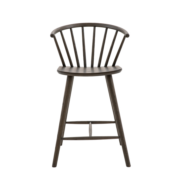 This stylish barstool features elegant turned legs and back spindles and a gently shaped seat. The wood has a lovely deep brown finish. Also available in a natural finish. Matching and coordinating pieces available. Material: Oak / Oak Veneered MDF Product Zone: Indoor Shape: Round Seat Height: 655mm Seat Width between arms: 450mm Seat Depth: 450mm Leg / Feet Height: 624mm Clearance to Floor: 624mm