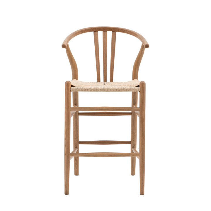 Set of 2 stand out wishbone back bar stools, perfect for modern or vintage inspired kitchens and dining spaces. A contemporary twist on a classic design, this bar stool features elegant sleek lines, a deeply curved back and a distinctive hand woven seat. Pack Of: 2 Material: Elm / Kraft Paper Product Zone: Indoor Seat Height: 650mm Seat Width between arms: 445mm Seat Depth: 410mm Leg Finish: Matte Lacquer Clearance to Floor: 650mm Assembly Required: No Anti Topple Kit: No