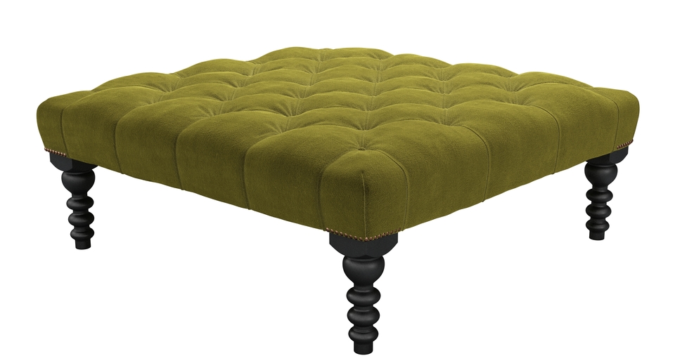 A real classic with luxurious, deep pleated buttons that will add glamour and sophistication to any room. Great for looking at, putting magazines on and for putting your feet up too. Buttons and twiddly legs! This is one fancy footstool (https://www.sofa.com/gb/accessories/footstools). back cushions: see website color: green covers: see website seat cushions: see website size: Large Square Footstool