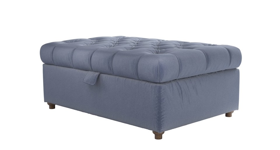 Buttons and twiddly legs! This is one fancy footstool. back cushions: see website color: blue covers: see website seat cushions: see website size: Medium Rectangular Storage Footstool