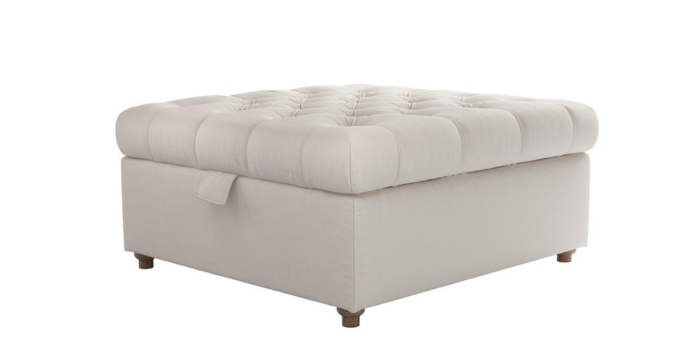 Buttons and twiddly legs! This is one fancy footstool. back cushions: see website color: natural covers: see website seat cushions: see website size: Medium Square Storage Footstool