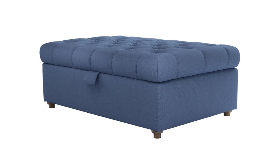 Buttons and twiddly legs! This is one fancy footstool. back cushions: see website color: blue covers: see website seat cushions: see website size: Medium Rectangular Storage Footstool