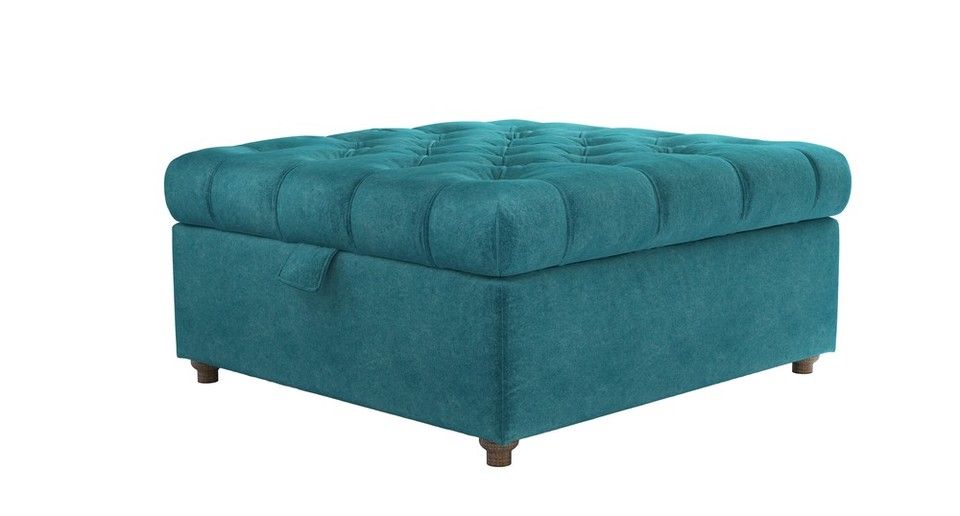 Buttons and twiddly legs! This is one fancy footstool. back cushions: see website color: green,blue covers: see website seat cushions: see website size: Medium Square Storage Footstool