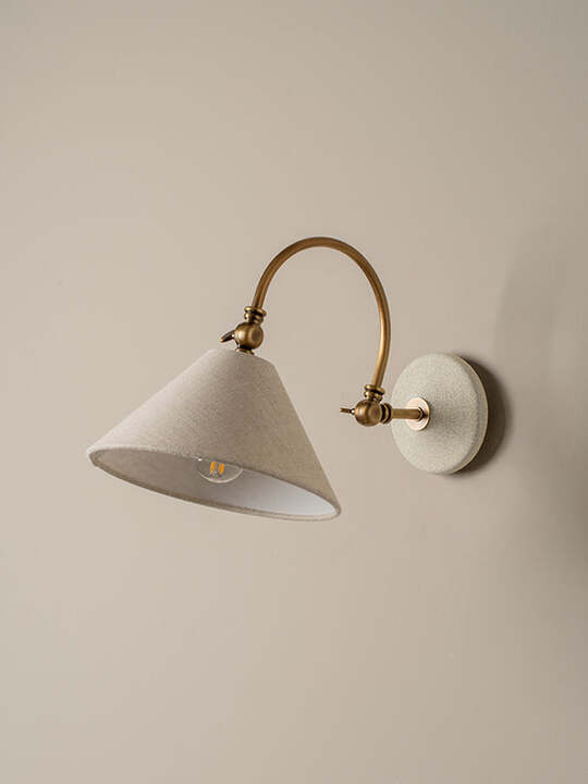 A modern classic, the Bourton wall light merges traditional detailing with modern forms. A crackle ceramic glaze wall plate, an over-arch design with aged brass adjustable joints. This is a practical task lamp as well as a curvaceous beauty.