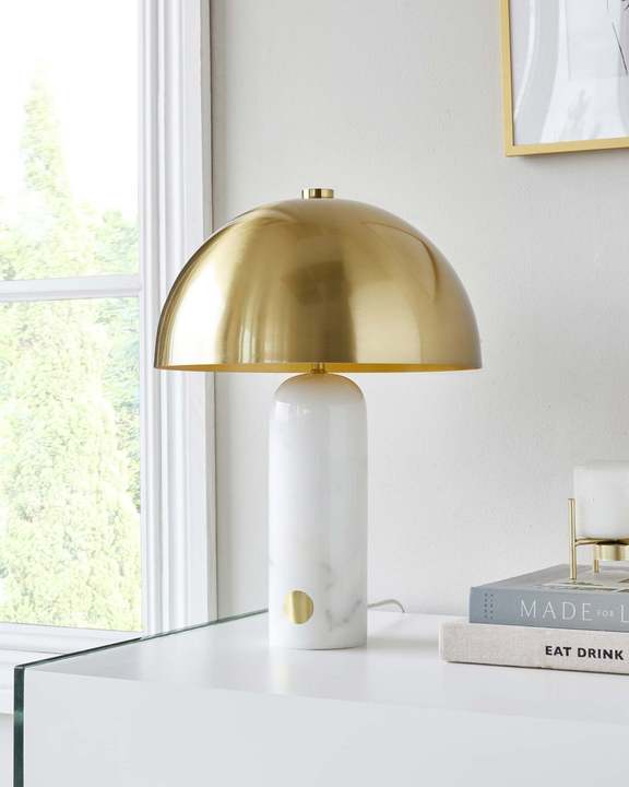 The Louis table lamp brings sophisticated style to any surface with its striking white marble base and warm brass finish. Each marble base is naturally unique, topped with a metallic domed shade that casts a gentle, ambient glow. Perfect for bedside tables or console surfaces, this contemporary piece features a touch-sensitive dial for effortless operation.