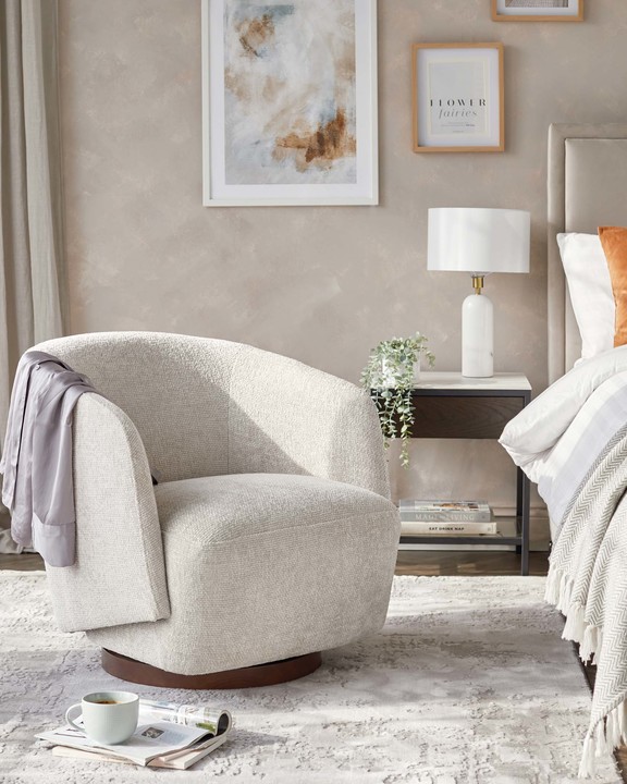 Create your perfect corner with the Natalia natural chunky weave swivel accent chair. Its 360-degree swivel mechanism makes conversation effortless, while the soft, textured chunky weave fabric in a creamy natural tone brings warmth to any space. Compact enough for smaller rooms yet generous enough for comfortable lounging, this versatile chair works beautifully as a reading spot or additional seating.
