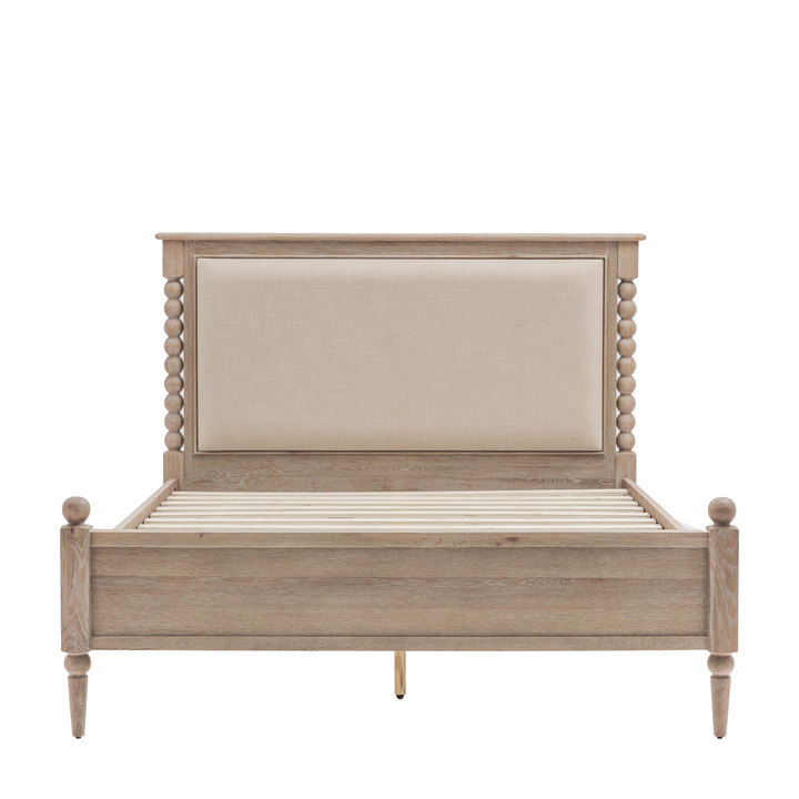 This bed combines timeless design with superior craftsmanship. Highlighted by hand-turned bobbin details, it is constructed from oak with a soft lime-wash finish, creating a warm and inviting aesthetic. This bed offers a practical yet stylish foundation for a wide range of interior styles. Material: Foam / Pine / Plywood / Polyester / Oak Product Zone: Indoor Clearance to Floor: 210mm Assembly Required: Yes - Full Assembly Footboard Height: 585mm Under Bed Storage Height: 210mm