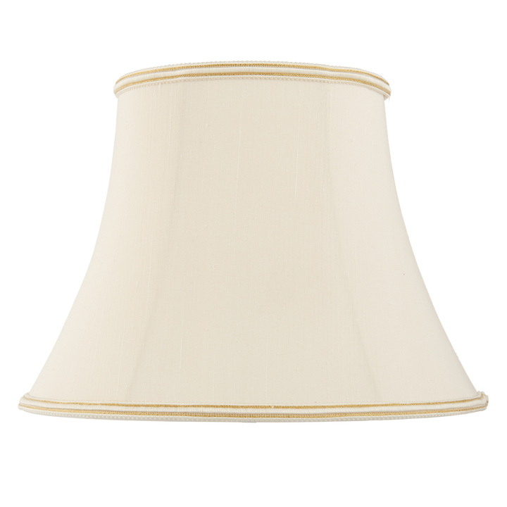 A classic 20 inch handmade lamp shade is a balloon lined bowed oval in a cream fabric with a subtle woven trim on the top and bottom edges. Available in a choice of sizes. Note - this shade has a fixed gimbal and is not suitable for use with pendants. Material: Fabric Product Zone: Indoor Bulb Included: No Bulb Type: 60W E27 or B22 GLS Product Lumens: 700 Lumens Per Watt: 12 IP Rating: 20 Additional Information: Dia Top Shade: 225-295mm. Dia Bottom Shade: 395-515mm