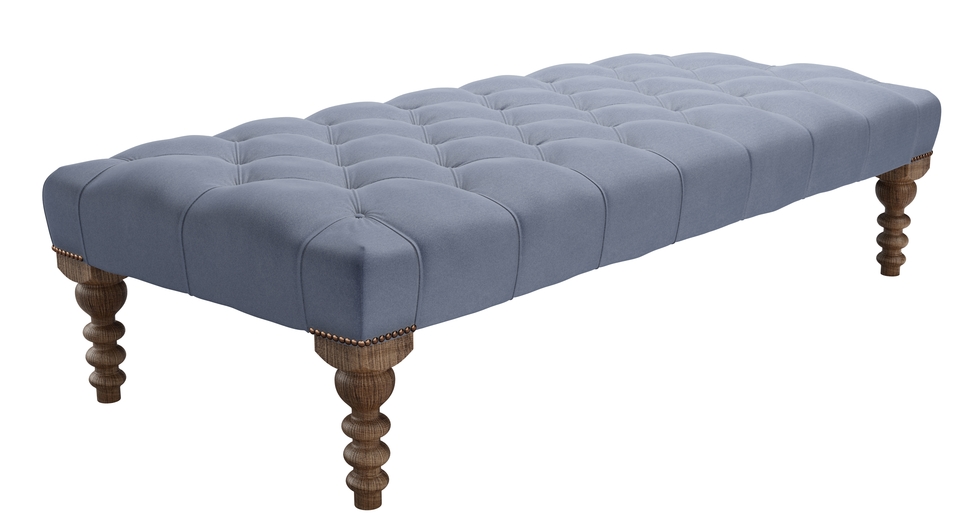 A real classic with luxurious, deep pleated buttons that will add glamour and sophistication to any room. Great for looking at, putting magazines on and for putting your feet up too. Buttons and twiddly legs! This is one fancy footstool (https://www.sofa.com/gb/accessories/footstools). back cushions: see website color: blue covers: see website seat cushions: see website size: Large Rectangular Footstool