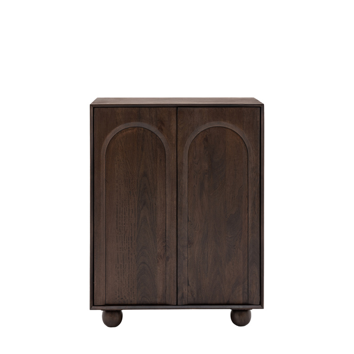 Bring 70s fashion into the present day with this twist on classic retro style. Featuring relief arch patterns and rounded ball feet this 2 door cupboard makes a bold style statement while also being a great storage solution. Made from Mango wood stained to a lovely dark tone to highlight the woods rich grains. Each piece is made from high-quality mango wood, celebrating the natural beauty of the material. With distinctive grain patterns, rich tones, and unique markings, no two pieces are exactly alike. These organic variations add character and charm, making each item a one-of-a-kind statement. Designed to embrace the raw elegance of nature, this product brings warmth and authenticity to any space.