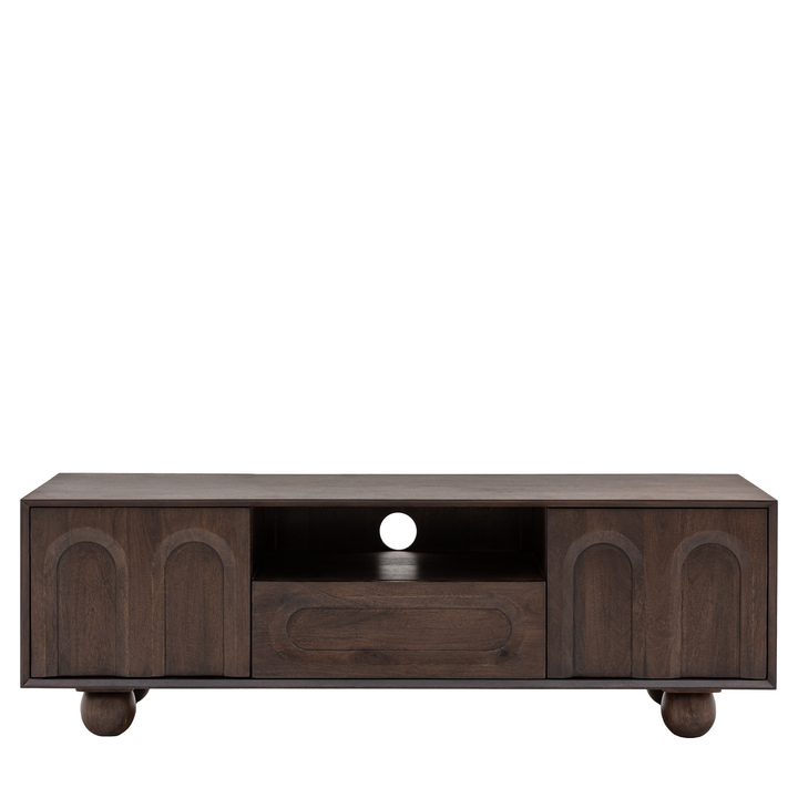 Make a bold style statement and store all of your electronics securely with this fabulaus 70s influenced media unit. Made from Mango wood stained to a dark tone to highlight the rich grains, the cupboard doors feature retro inspired relief arch designs and give you plenty of space to hide away all your gadgets. Each piece is made from high-quality mango wood, celebrating the natural beauty of the material. With distinctive grain patterns, rich tones, and unique markings, no two pieces are exactly alike. These organic variations add character and charm, making each item a one-of-a-kind statement. Designed to embrace the raw elegance of nature, this product brings warmth and authenticity to any space.