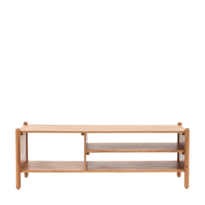 With a retro design influence and modern twist, this media unit will add a little style to your media set up. Made with rich Acacia wood the split shelf layout offers plenty of space for all of your electronics without sacrificing style. Coordinating pieces also available. Material: Acacia Product Zone: Indoor Shape: Rectangle Leg / Feet Height: 200mm Clearance to Floor: 200mm Storage: 1 Shelf Internal Cupboard Size: W560 x D355 x H310mm Distance between shelves: 145mm