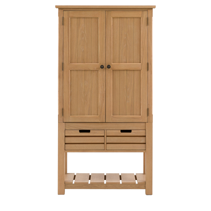Offering plenty of storage space with an upper cupboard, 2 drawers and a planked lower shelf, this cupboard is the perfect addition to any cosy country kitchen. The traditional rustic elements are given a contemporary twist with the natural finish, grooved door & drawer fronts and metal handle details. Due to the handmade nature of this product, colour variations may be present.