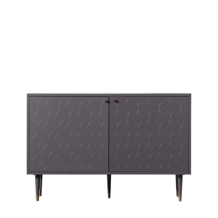 Add an eye-catching feature piece to a room with this stunning grey two door cabinet. The unit combines colour and shape to great effect, with a routed geometric circular pattern on the doors which has a hint of Bauhaus influence. Brass handles are complemented by brass ‘socks’ on the painted solid oak legs. The cabinet is also available in three other colours, and there are matching and coordinating pieces in the collection.\n\nThe collection of living furniture is part of our Packed-Flat Design Project, offering easy delivery to any room in any property, whilst reducing the packaging needed. Easy assembly is required, but all the tools needed are supplied.