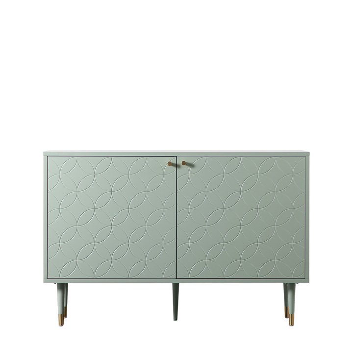 Add an eye-catching feature piece to a room with this stunning mint green two door cabinet. The unit combines colour and shape to great effect, with a routed geometric circular pattern on the doors which has a hint of Bauhaus influence. Brass handles are complemented by brass ‘socks’ on the painted solid oak legs. The cabinet is also available in three other colours, and there are matching and coordinating pieces as part of the collection.\n\nThe collection of living furniture is part of our Packed-Flat Design Project, offering easy delivery to any room in any property, whilst reducing the packaging needed. Easy assembly is required, but all the tools needed are supplied.