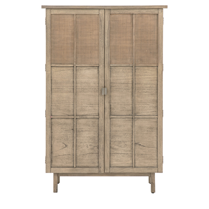 Developed with Japandi influences to give the ideal fusion of Japanese and Scandinavian design. The perfect range to add a touch of unique style to any interior, featuring a traditional lightly weathered finish with modern slatted detailing, cane panel inserts on some doors and brushed bronze handles. This two door cupboard features handwoven cane inset into the top section of the doors, paired with Mindy ash solids and veneers, in a soft natural colour. Also including a sideboard, media unit, coffee and console table, plus a practical supper table and unique slatted side table, this collection adds a touch of simplistic minimalisation to any interior space. Due to the handmade nature of this product colour variations may be present.