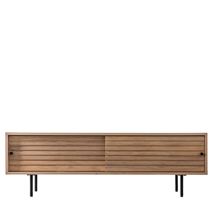 This unique collection offers a range of living, dining and bedroom furniture with a beautiful contemporary Japandi style. Crafted from solid oak and oak veneers, great attention to detail has been given to the design across the range to create these stunning pieces.\n\nThis media unit features sliding doors crafted from solid oak with routing detailing to echo the slats of other pieces in the range. Black metal legs and handles add the finishing touch. Material: Oak / Steel / MDF Clearance to Floor: 160mm Storage: 2 Doors / 4 Shelves Internal Cupboard Size: 670x360x250mm (2) Adjustable Shelves: Yes Assembly Required: Yes - legs / feet only