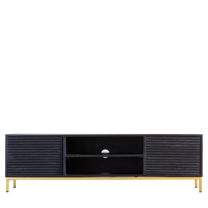 This media unit is an eye-catching piece, which can be used on its own or paired with other pieces from the range. The black mango wood, with its routing on the drawer fronts which creates a ripple effect that catches the light, is combined with a gold-finish metal base for a sophisticated apartment living look. Material: Mango Wood / Iron / Veneered MDF Product Zone: Indoor Storage: 2 Drawers / 2 Shelves Internal Cupboard Size: 360x360x160mm Adjustable Shelves: No Distance between shelves: 120x120mm Assembly Required: No