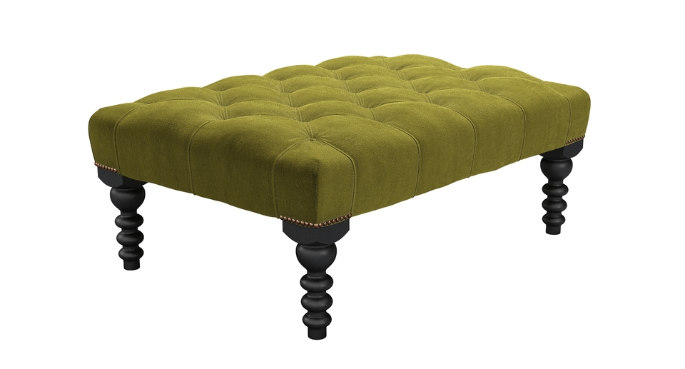 A real classic with luxurious, deep pleated buttons that will add glamour and sophistication to any room. Great for looking at, putting magazines on and for putting your feet up too. Buttons and twiddly legs! This is one fancy footstool (https://www.sofa.com/gb/accessories/footstools). back cushions: see website color: green covers: see website seat cushions: see website size: Medium Rectangular Footstool