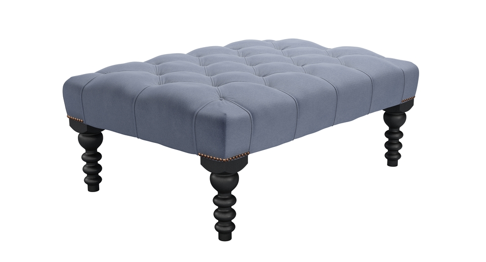 A real classic with luxurious, deep pleated buttons that will add glamour and sophistication to any room. Great for looking at, putting magazines on and for putting your feet up too. Buttons and twiddly legs! This is one fancy footstool (https://www.sofa.com/gb/accessories/footstools). back cushions: see website color: blue covers: see website seat cushions: see website size: Medium Rectangular Footstool
