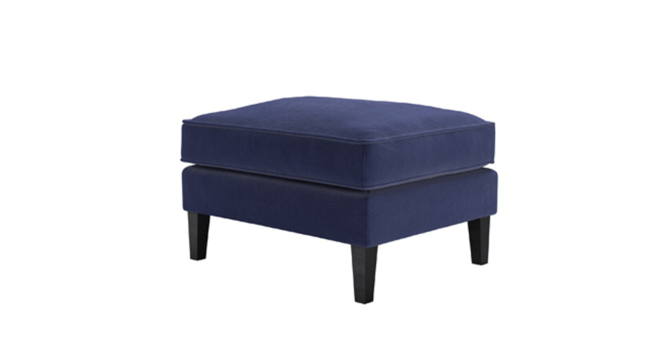 Slender, sleek and beautifully proportioned. back cushions: see website color: blue covers: see website seat cushions: see website size: Medium Rectangular Footstool