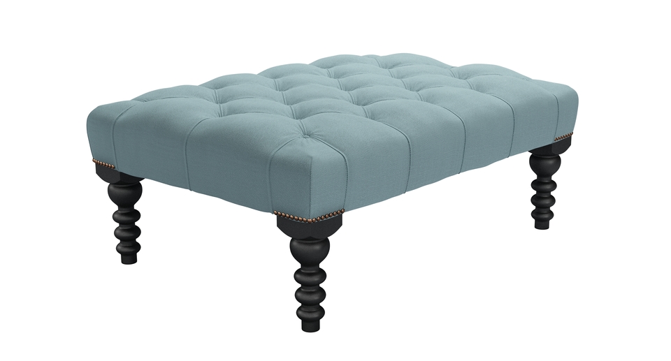 A real classic with luxurious, deep pleated buttons that will add glamour and sophistication to any room. Great for looking at, putting magazines on and for putting your feet up too. Buttons and twiddly legs! This is one fancy footstool (https://www.sofa.com/gb/accessories/footstools). back cushions: see website color: blue covers: see website seat cushions: see website size: Medium Rectangular Footstool