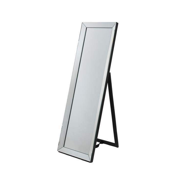 Timeless angled mirror framed with kick stand. Material: Glass / PS Type - Mirror: Cheval Style - Mirror: Glass on Glass Shape - Mirror: Rectangle Glass Type: Bevelled Frame Width: 57mm Fixing Type: Stand
