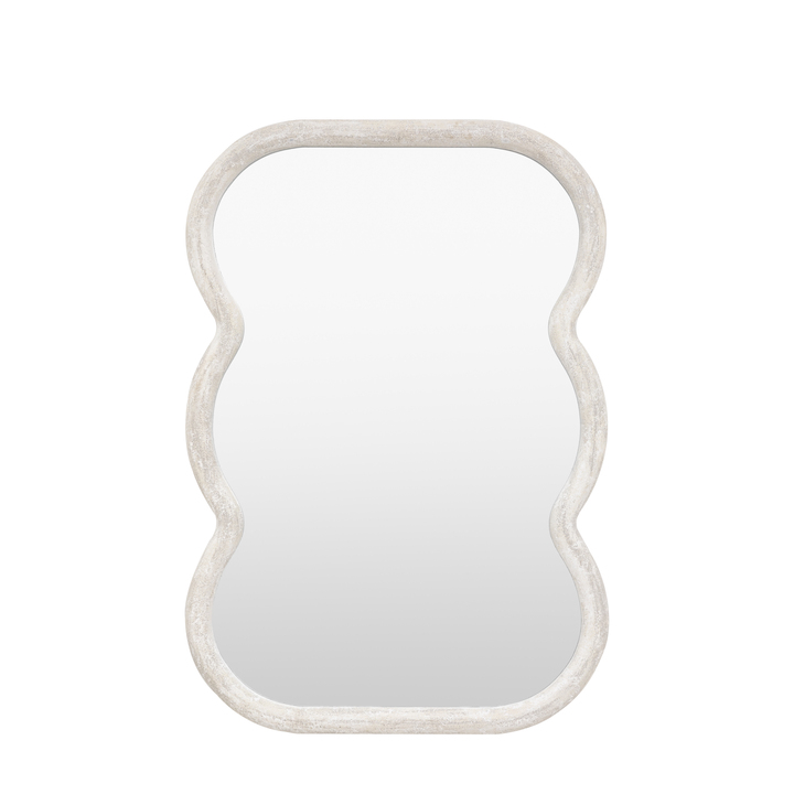 Gorgeous statement leaner mirror which elevates your space with our uniquely designed wavy edge mirror. This stunning full-length mirror is not just a reflective surface; it's a statement piece that adds a touch of artistic flair to any room. The wavy, contoured frame brings a modern, organic feel, breaking away from traditional straight-edged designs. Perfect for contemporary and eclectic interiors, this mirror will enhance the ambience of your living room, bedroom, or hallway, creating an eye-catching focal point. Material: MDF / Glass Product Zone: Indoor Type - Mirror: Wall Style - Mirror: Decorative Shape - Mirror: Rectangle Hanging Orientation: Both - Portrait & Landscape Glass Type: Plain Glass Size mm: 535x820 Frame Width: 40mm Frame Colour: Antique White Fixing Type: D-Ring Anti Topple Kit Included: No