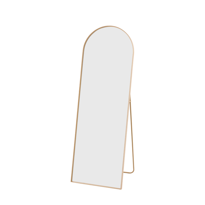 This striking self-standing design is perfect for bedrooms and living spaces alike. Its tall, arched silhouette creates a refined focal point, while the slim frame keeps the look clean and contemporary. Finished in an oak style finish on an aluminium frame, supported by a discreet matching ochre aluminium stand at the rear, this mirror combines stability with elegant simplicity, offering a modern, sculptural mirror that adds depth, light, and effortless style to any interior. Material: Glass / MDF / Aluminum Type - Mirror: Cheval Style - Mirror: Wood / Wood Effect Shape - Mirror: Rounded Rectangle Hanging Orientation: One Way Glass Type: Plain Glass Size mm: 500 x 1500mm Frame Colour: Oak Fixing Type: Stand
